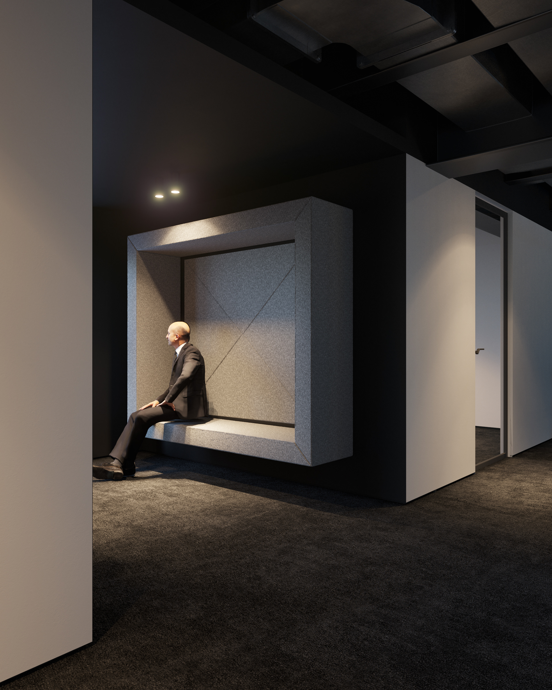 Новий офіс. Зона для неформальної бесіди. Монохром. Повсть та світло. New office. Area for informal Conversation. Monochrome. Felt and light.